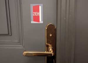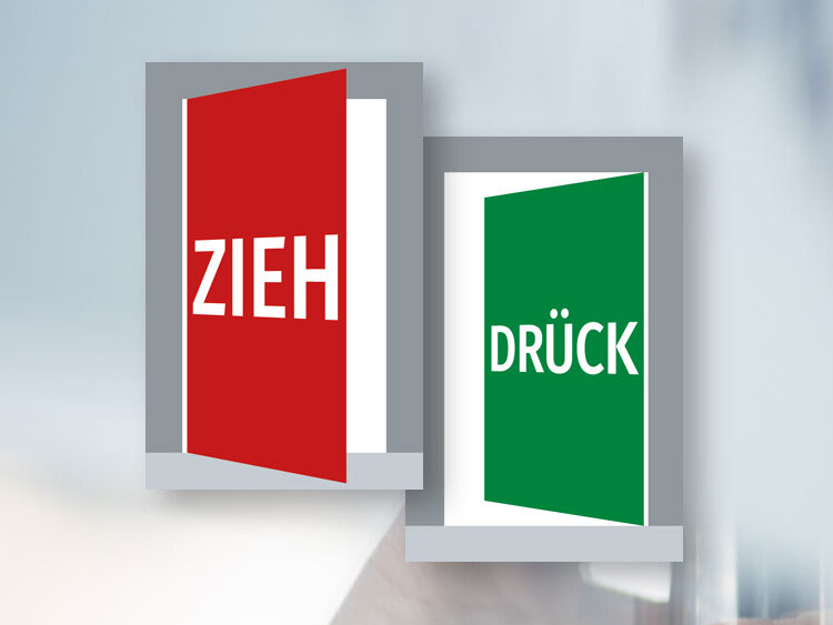 - Eine Packung beinhaltet ein Schild „Zieh“ und ein Schild „Drück“.