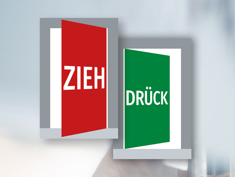 - Eine Packung beinhaltet ein Schild „Zieh“ und ein Schild „Drück“.