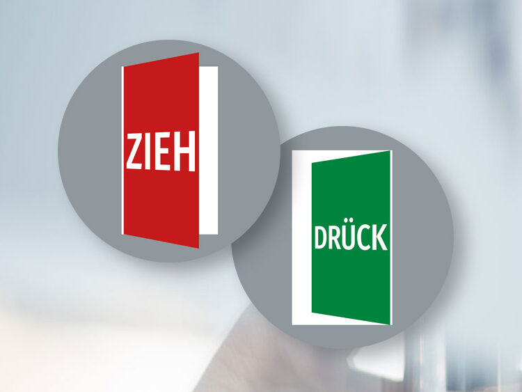 - Eine Packung beinhaltet ein Schild „Zieh“ und ein Schild „Drück“.